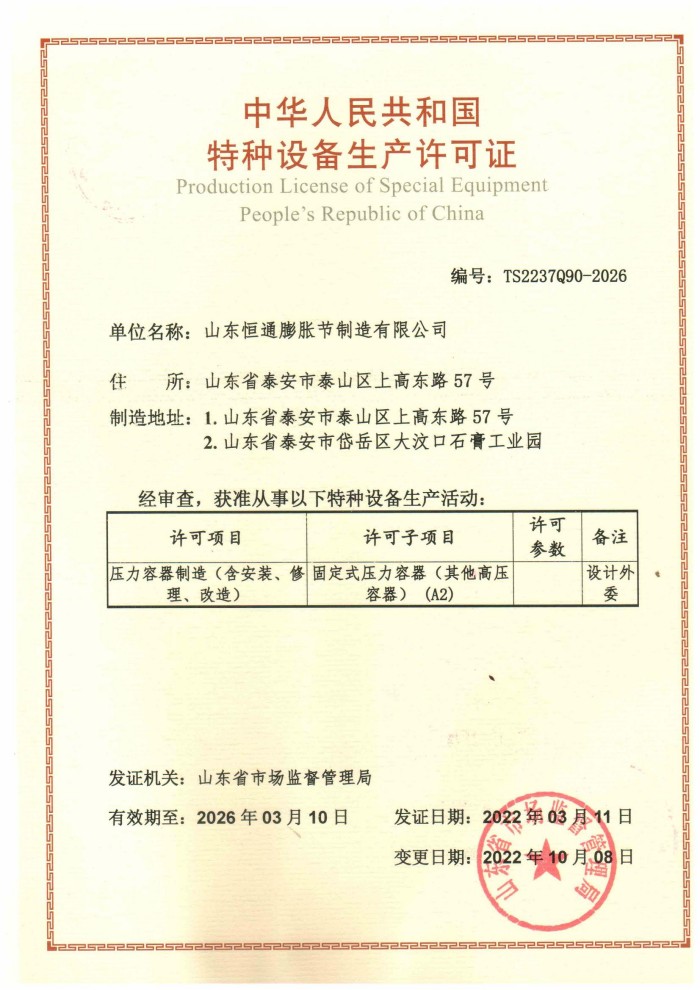 山東恒通膨脹節制造有限公司是一家集研發、設計、制造、銷售和服務于一體的大型膨脹節制造企業。公司取得我國特種設備制造許可證、壓力容器A1級資質、壓力管道元件A、B的資質,并且獲得了歐盟PED-CE認證、美國ASME“U”鋼印、ISO 9000質量管理體系認證、GB/T 14000 環境管理體系認證及GB/T 45000 職業健康安全體系認證。膨脹節產品涵蓋壓力管道波紋膨脹節、壓力容器波形膨脹節、金屬波紋管、金屬軟管...
